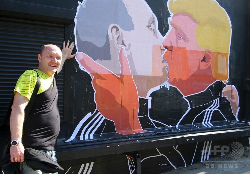 【5月14日 AFP】米大統領選で共和党の指名獲得を確実にしたドナルド・トランプ(Donald Trump)氏とロシアのウラジーミル・プーチン(Vladimir Putin)大統領が情熱的なキスを交わす場面を描いたストリートアートが13日、リトアニアのソーシャルメディアで急速に拡散した。トランプ氏の対ロシア政策への懸念を示すものだとみられる。