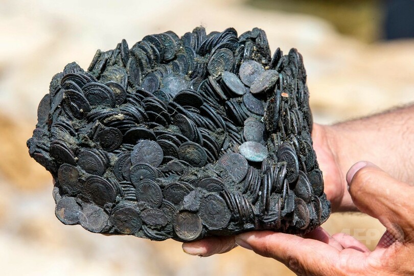 【5月16日 AFP】(訂正)イスラエル考古学庁(IAA)は16日、地中海に面する古代の港湾遺跡カイサリア(Caesarea)の沖合で1600年前に沈没した商船から発見された、銅像や貨幣を含む古代ローマ時代の希少な遺物を公開した。
