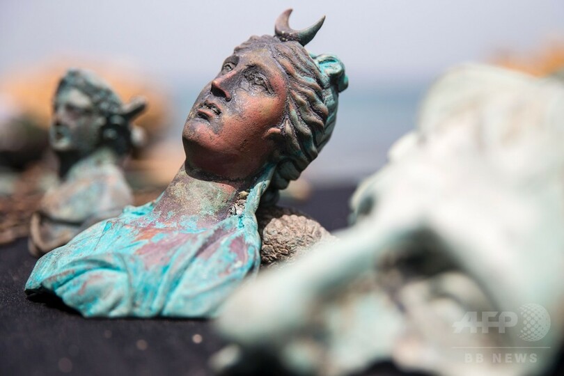 【5月16日 AFP】(訂正)イスラエル考古学庁(IAA)は16日、地中海に面する古代の港湾遺跡カイサリア(Caesarea)の沖合で1600年前に沈没した商船から発見された、銅像や貨幣を含む古代ローマ時代の希少な遺物を公開した。