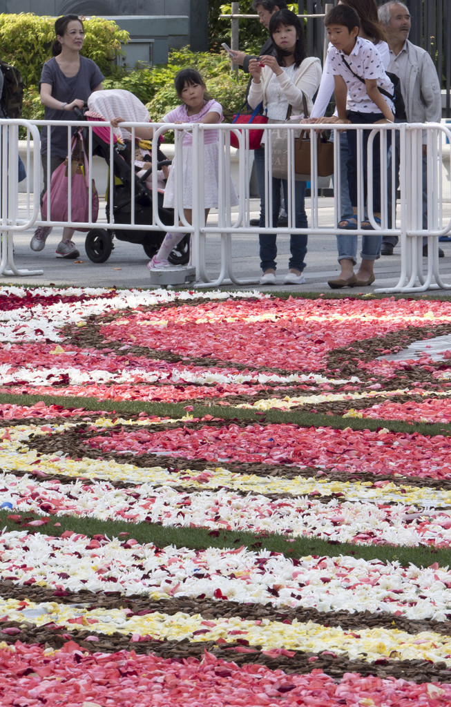 「フラワーカーペット」はベルギーの首都ブリュッセル(Brussels)で2年に1度開かれる花の祭典で、東京での開催は今回が初めて。ベルギーから招いた技術者とともに、地元の小学生らボランティア約100人がバラや菊など7万株分の花びらを並べ、水に溶かしたのりを繰り返し散布して20メートル四方の鮮やかなカーペットを作り上げた。