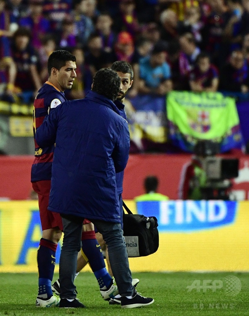 【5月23日 AFP】(更新)FCバルセロナ(FC Barcelona)のルイス・スアレス(Luis Suarez)が22日、セビージャFC(Sevilla FC)と対戦したスペイン国王杯(Copa del Rey 2015-16)決勝で負傷し、涙を流しながらピッチを後にした。