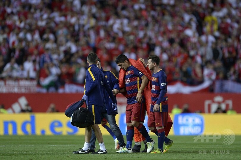 【5月23日 AFP】(更新)FCバルセロナ(FC Barcelona)のルイス・スアレス(Luis Suarez)が22日、セビージャFC(Sevilla FC)と対戦したスペイン国王杯(Copa del Rey 2015-16)決勝で負傷し、涙を流しながらピッチを後にした。