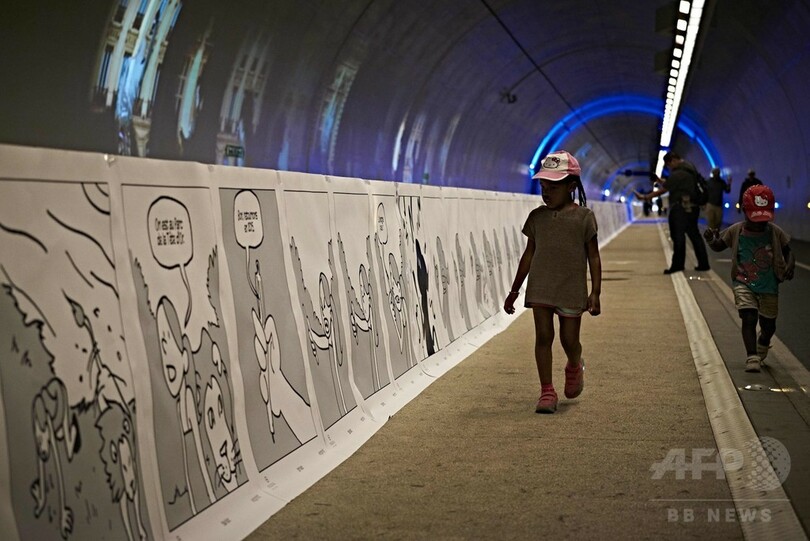 【5月23日 AFP】フランス・リヨン(Lyon)で21日、「リヨン漫画祭(Lyon BD Festival)」の一環として1.6キロメートルを超えるコマ続きの漫画がトンネル内の壁に展示された。