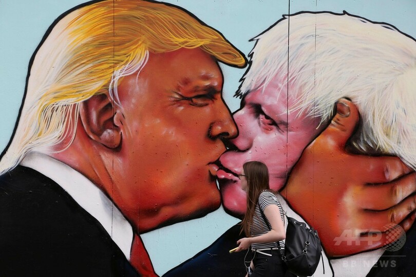 【5月25日 AFP】米大統領選で共和党の候補指名を確実にしたドナルド・トランプ(Donald Trump)氏と英ロンドン(London)前市長のボリス・ジョンソン(Boris Johnson)氏が情熱的なキスを交わす場面を描いた巨大な壁画が英南西部ブリストルに現れた。