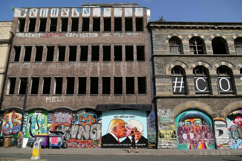 【5月25日 AFP】米大統領選で共和党の候補指名を確実にしたドナルド・トランプ(Donald Trump)氏と英ロンドン(London)前市長のボリス・ジョンソン(Boris Johnson)氏が情熱的なキスを交わす場面を描いた巨大な壁画が英南西部ブリストルに現れた。