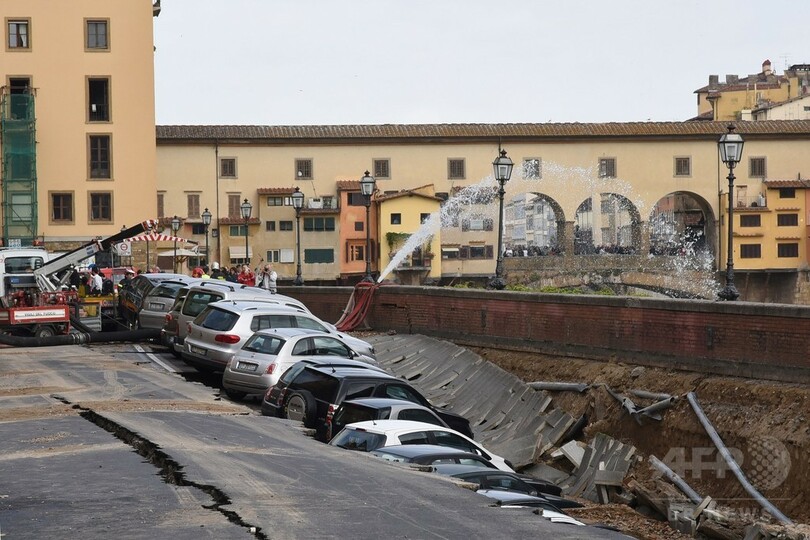 陥没が発生したのは、14世紀に建造された世界的に名高いベッキオ橋(Ponte Vecchio)とグラツィエ橋(Ponte alle Grazie)の間。消防当局によると水道管の破裂が原因だという。また、地元当局者によるとけが人は出ていない。(c)AFP