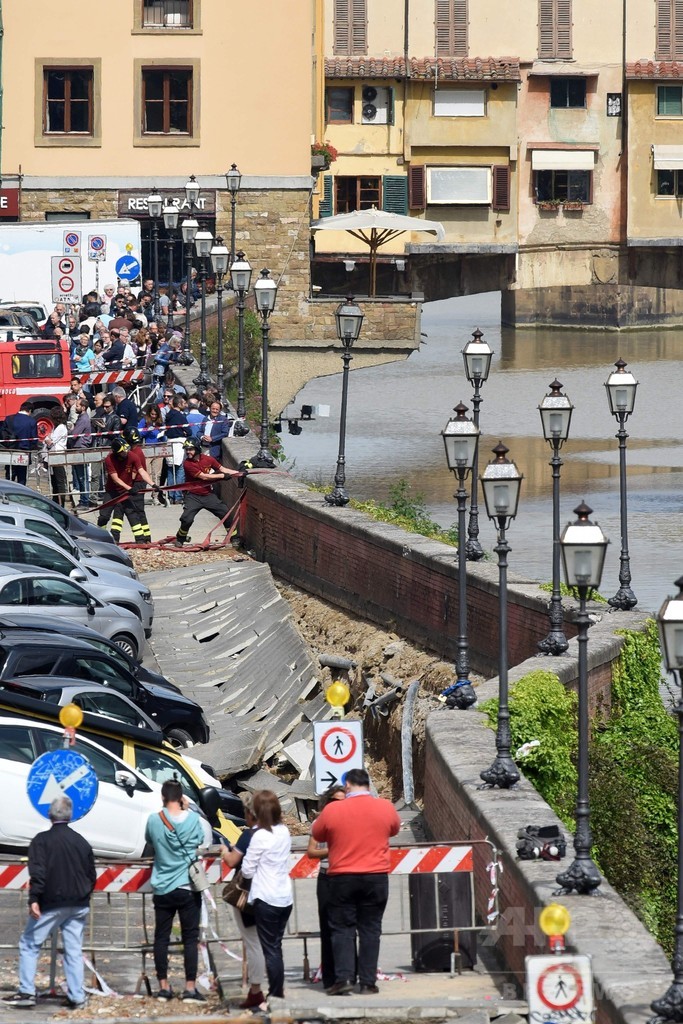 陥没が発生したのは、14世紀に建造された世界的に名高いベッキオ橋(Ponte Vecchio)とグラツィエ橋(Ponte alle Grazie)の間。消防当局によると水道管の破裂が原因だという。また、地元当局者によるとけが人は出ていない。(c)AFP