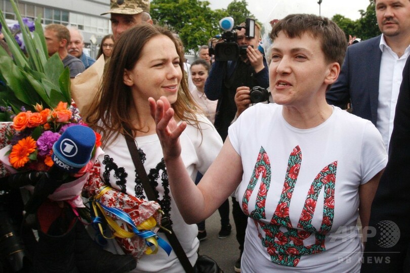 【5月25日 AFP】(更新、写真追加)紛争下のウクライナ東部でロシア国営テレビの記者2人が迫撃砲で死亡した事件に関与した罪で、ロシアで懲役刑を言い渡され2年近く収監されていたウクライナ軍の女性パイロット、ナディア・サフチェンコ(Nadiya Savchenko)氏が25日、捕虜交換の一環として釈放され、ウクライナに帰国した。