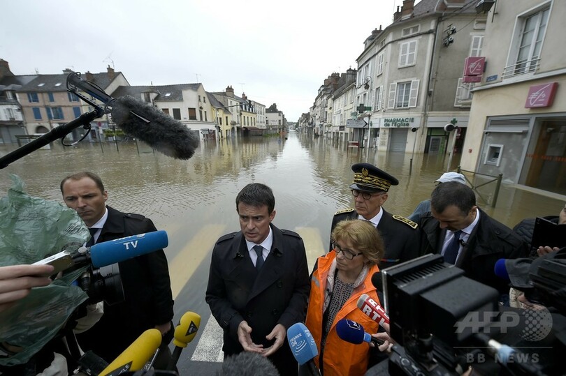 フランスのマニュエル・バルス(Manuel Valls)首相は同日、パリの南約80キロの、ロワン(Loing)川の氾濫で住民が避難を余儀なくされたヌムール(Nemours)を視察した。(c)AFP