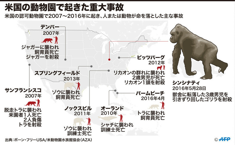 【6月3日 AFP】米国の動物園で近年起き、人または動物が命を落とした主な事故を示した図。