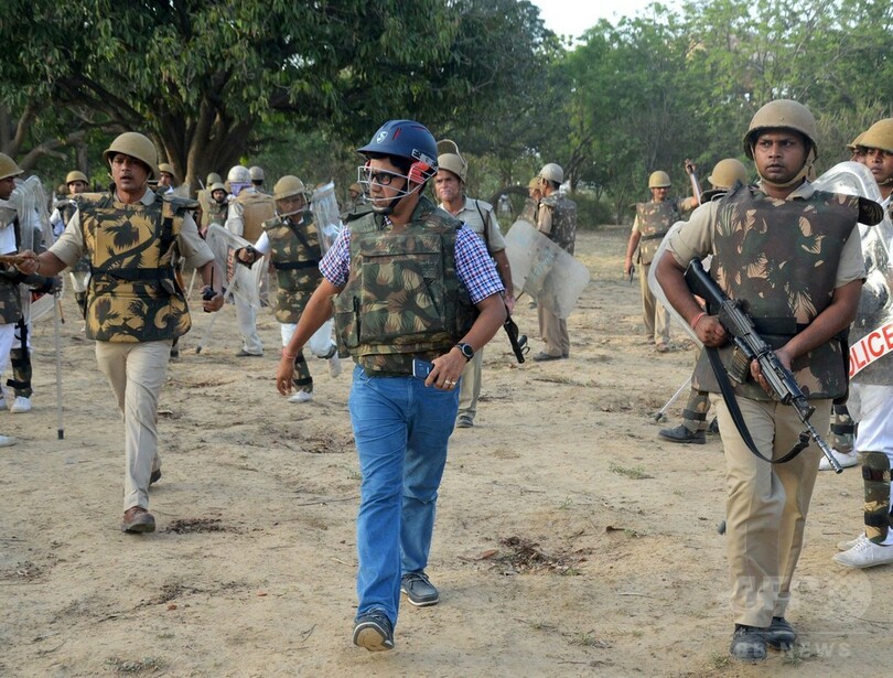 ウッタルプラデシュ州の警察幹部によれば、集団のメンバー1000人以上を逮捕し、現場は封鎖された。この集団は2014年後半から公園内の土地270エーカー(約1平方キロ)を占拠し、数百のテントや木造の小屋を建てて居座っていたが、このほど当局が裁判所命令を得て強制排除が実行された。(c)AFP