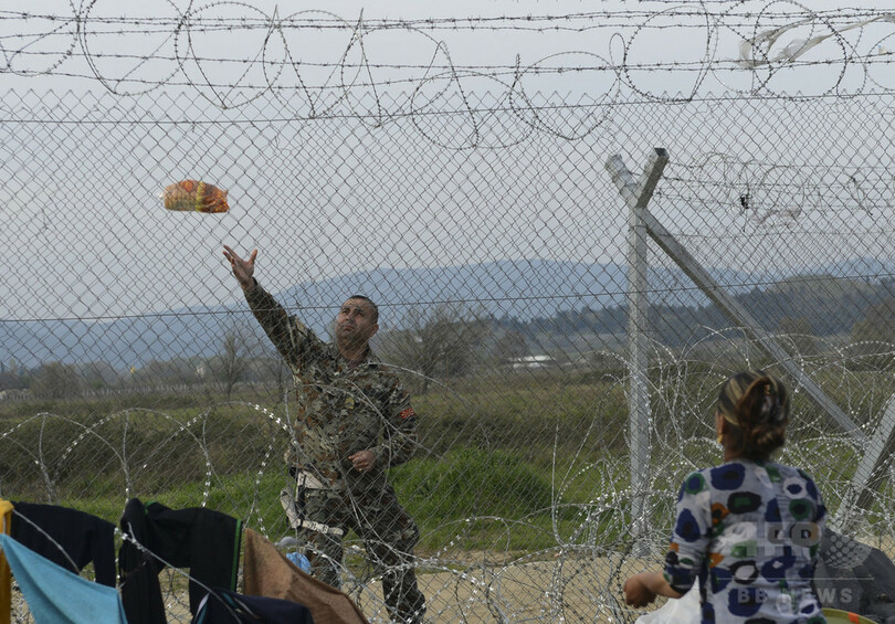 シリア難民の女性に、鉄条網越しにパンを投げるマケドニアの兵士。(c)AFP/Bulent Kilic