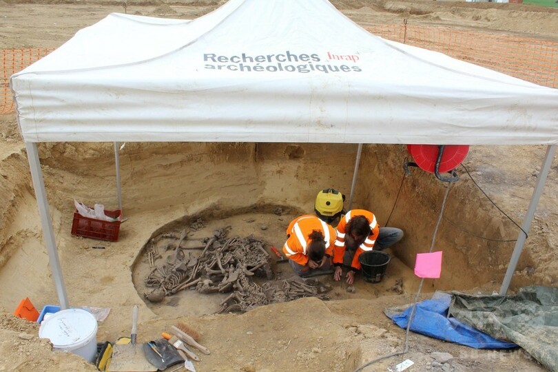 仏国立予防考古学研究所(INRAP)のチームは記者団に対し、仏東部ストラスブール(Strasbourg)郊外にある、穀物や他の食物を保存するために使われていた古代の「サイロ」300個のうちの1つで、10人の人骨が発見されたと述べた。