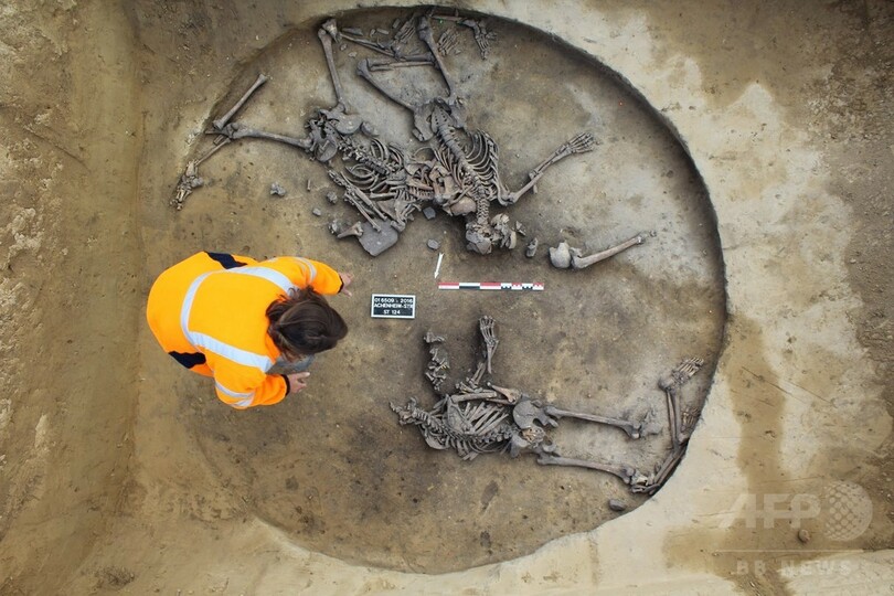 仏国立予防考古学研究所(INRAP)のチームは記者団に対し、仏東部ストラスブール(Strasbourg)郊外にある、穀物や他の食物を保存するために使われていた古代の「サイロ」300個のうちの1つで、10人の人骨が発見されたと述べた。