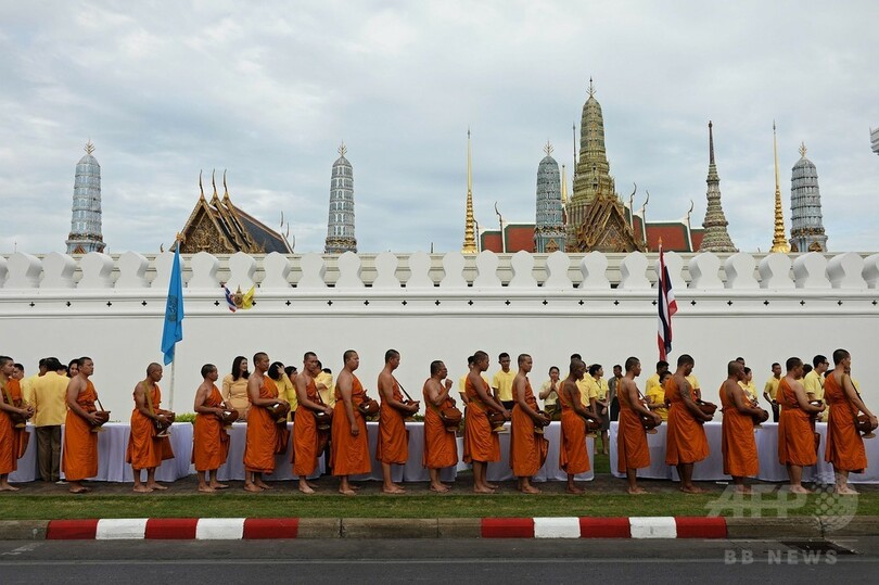 【6月9日 AFP】タイのプミポン・アドゥンヤデート(Bhumibol Adulyadej)国王(88)が9日、即位70年を迎え、オレンジ色の僧衣を着た大勢の仏僧が記念行事を先導した。プミポン国王は入院中で、国王の健康状態をめぐる不安は高まっている。
