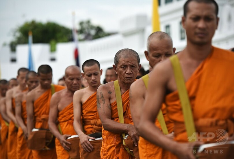 【6月9日 AFP】タイのプミポン・アドゥンヤデート(Bhumibol Adulyadej)国王(88)が9日、即位70年を迎え、オレンジ色の僧衣を着た大勢の仏僧が記念行事を先導した。プミポン国王は入院中で、国王の健康状態をめぐる不安は高まっている。