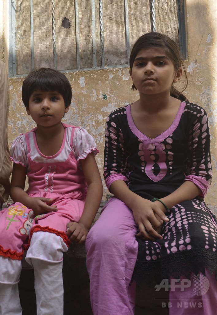 パキスタン東部ラホール(Lahore)で8日に撮影された写真に写るのは、マハム(Maham)さん(10)とムスカン(Muskan)さん(10)。2人が見つめる場所ではこのわずか数時間前、ジーナト・ビビ(Zeenat Bibi)さん(16)が体に灯油をかけられ、火をつけられて殺害された。