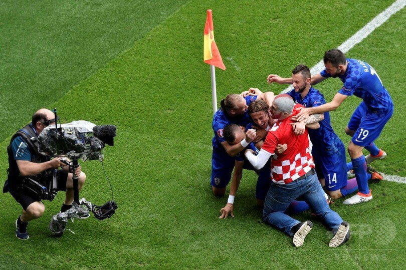 欧州選手権の試合でファンが侵入、クロアチアの歓喜の輪に加わる