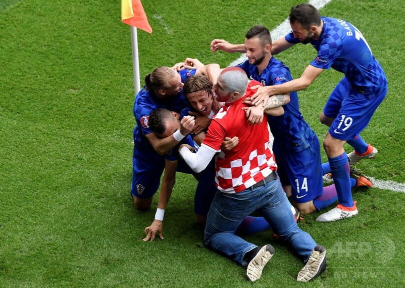 【6月13日 AFP】12日に行われたサッカー欧州選手権2016(UEFA Euro 2016)のグループD、クロアチア対トルコの試合で、ファンがピッチに侵入し、選手と一緒にゴールを喜ぶ場面があった。