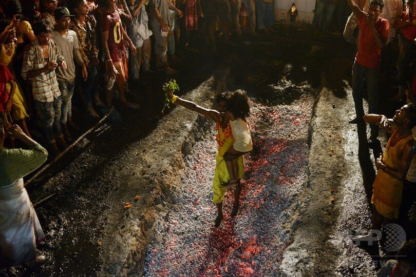 燃え盛る石炭の上に子ども落とす、ヒンズー教儀式で インド