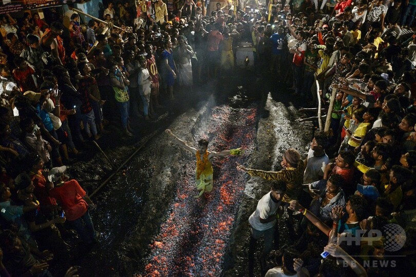 古くからのヒンズー教の習わしでは、燃える石炭の上を歩くこの儀式の前に信者は7日間絶食しなければならないという。3年前にもこの儀式に参加した母親が娘を抱いたまま石炭の上に転倒する事故が起きている。(c)AFP