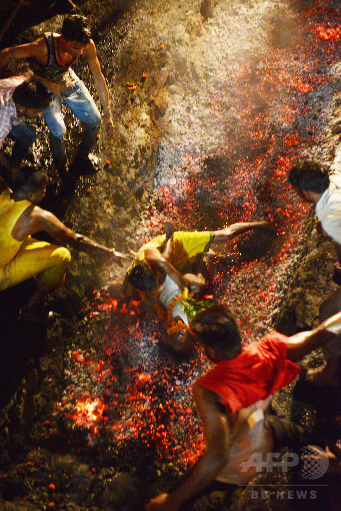 古くからのヒンズー教の習わしでは、燃える石炭の上を歩くこの儀式の前に信者は7日間絶食しなければならないという。3年前にもこの儀式に参加した母親が娘を抱いたまま石炭の上に転倒する事故が起きている。(c)AFP