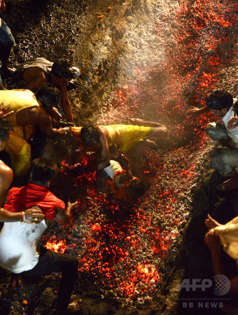 古くからのヒンズー教の習わしでは、燃える石炭の上を歩くこの儀式の前に信者は7日間絶食しなければならないという。3年前にもこの儀式に参加した母親が娘を抱いたまま石炭の上に転倒する事故が起きている。(c)AFP