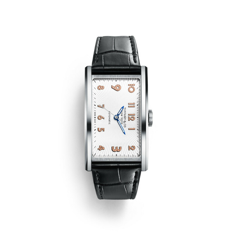 1940年代のティファニー製トラベルクロックに着想を得た、文字盤を横に倒した大胆なデザインで人気の「ティファニー イースト ウエスト」コレクション。新作は、従来のコレクションより 一回り大きくなった46.5x27.5mmのウォッチケースに、時計製造の最高峰スイスで生産された自動巻きメカニカル ムーブメントを搭載。ラジアル ギョーシェ加工の文字盤にプードレ仕上げのインデックスをあしらい、ウォッチの前面とケースバックにはサファイヤ クリスタルを使った。