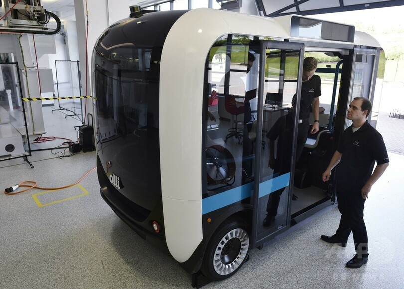 公開されたのは、3Dプリントされたミニバス「Olli」。アリゾナ(Arizona)州を拠点とする新興メーカー、ローカルモーターズ(Local Motors)が手掛けた定員12人の電気自動車だ。