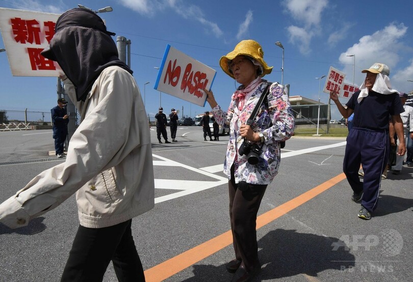 【6月18日 AFP】沖縄県名護市にある米海兵隊基地キャンプ・シュワブ(Camp Schwab)のゲート前で17日、米軍基地の存在に抗議するデモが行われた。