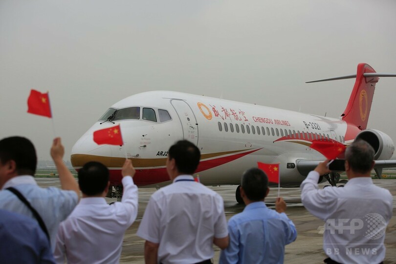 【6月28日 AFP】中国初の国産リージョナルジェット機「ARJ21-700」が28日、中国南西部・四川(Sichuan)省の成都(Chengdu)から東部・上海(Shanghai)まで初飛行を行った。上海虹橋国際空港(Shanghai Hongqiao International Airport)では、集まった人々が中国国旗を振って祝った。