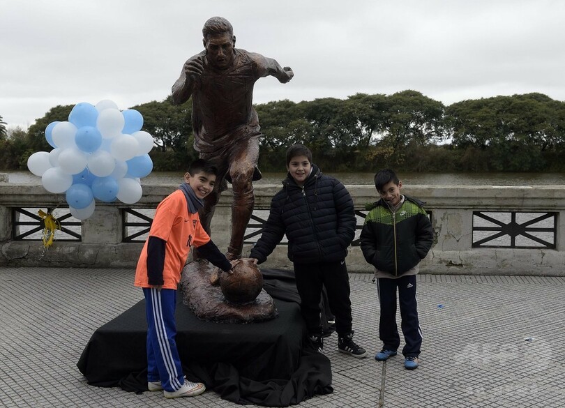 ブエノスアイレス市役所は28日、同市の「スポーツ・ウォーク・オブ・フェイム」とされる通りに建てた、メッシの銅像をお披露目している。(c)AFP