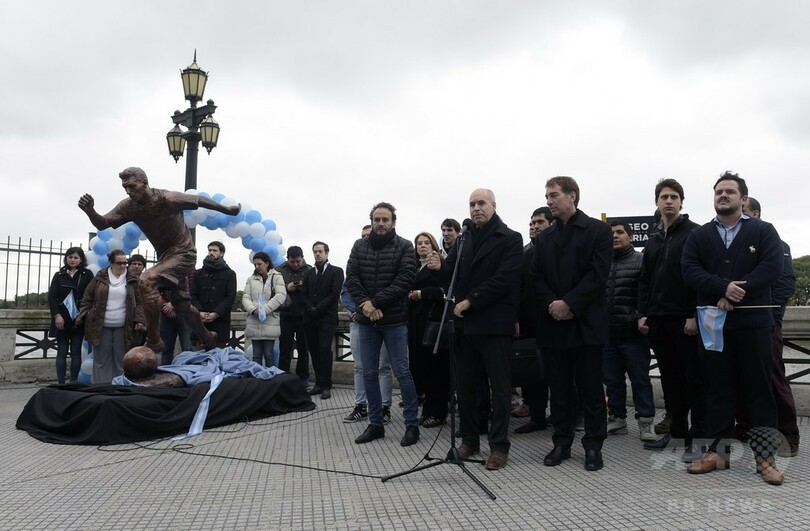 ブエノスアイレス市役所は28日、同市の「スポーツ・ウォーク・オブ・フェイム」とされる通りに建てた、メッシの銅像をお披露目している。(c)AFP