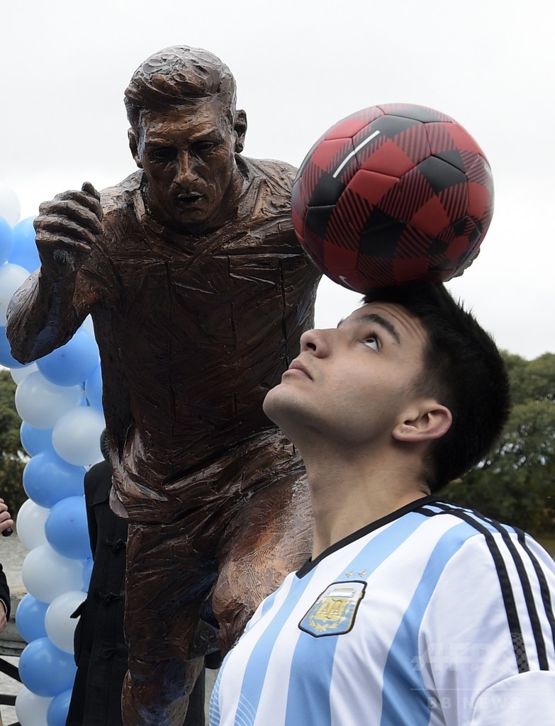 ブエノスアイレス市役所は28日、同市の「スポーツ・ウォーク・オブ・フェイム」とされる通りに建てた、メッシの銅像をお披露目している。(c)AFP