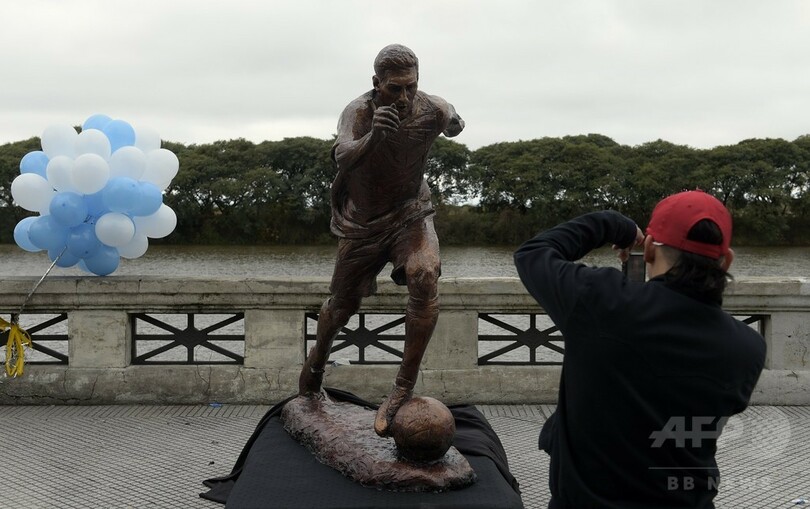 ブエノスアイレス市役所は28日、同市の「スポーツ・ウォーク・オブ・フェイム」とされる通りに建てた、メッシの銅像をお披露目している。(c)AFP