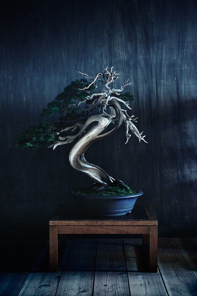 平尾の人生の転機は、大学時代。京都産業大学(Kyoto Sangyo University)在学中に京都の東福寺(Tofuku-ji Temple)で見た枯山水・方丈庭園(Hojo Garden)に感銘を受けたことから盆栽師を目指した。「その庭を見たとき、自分の悩んでいたことが小さく感じられた。そのとき修行や継承という言葉に憧れた」。そして戦後を代表する盆栽家のひとり、故・加藤三郎(Saburo Kato)に弟子入りし、そこで植物と対峙(たいじ)する精神を学んだという。「三郎先生には緊張と緩和、そして作品に遊び心を取り入れることを教わった」。彼が今でもそばに置くゴールドのはさみは、師匠から譲り受けた形見だ。