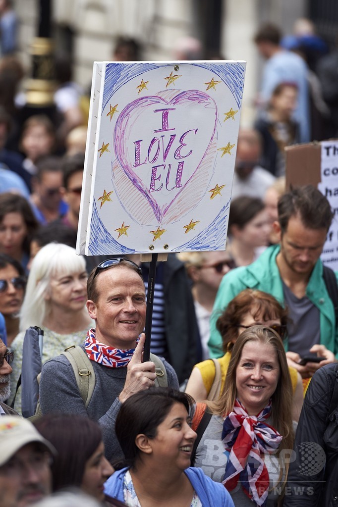 【7月3日 AFP】英ロンドン(London)中心部で2日、英国の欧州連合(EU)離脱(ブレグジット、Brexit)に抗議するデモ行進「March for Europe(欧州のための行進)」が行われ、主催者発表で4万人以上が参加した。
