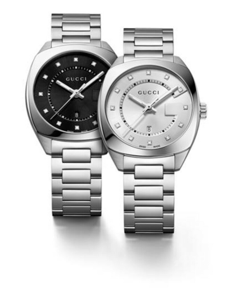 丸みを帯びたスクエアシェイプがヴィンテージ感のあるステンレススチールケースには、’G’のモノグラムシャドウを立体的にあしらったホワイトまたはブラックのサンブラッシュ ダイアルを合わせ、異なるデザインのインデックスが個性を演出。ケースはブラッシュおよびポリッシュ仕上げのスポーティなデザイン、またはクラシカルなポリッシュ仕上げを用意し、コンビネーションごとに異なる表情を楽しむことができる。インデックスにダイヤモンドをあしらったプレシャスバージョンは、パヴェ ダイヤモンド ベゼルやゴールド プレーテッド仕上げのケースを上品に組み合わせた。