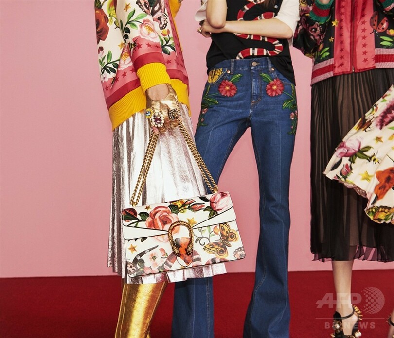 ウィメンズ ウェアおよびアクセサリーからなる同コレクションは、クリエイティブ・ディレクター、アレッサンドロ・ミケーレ(Alessandro Michele)による、ブランドアイコンの動植物を取り入れた新しいプリントが特徴だ。咲き乱れるカーネーションやローズに囲まれて顔を出すのは、カラフルなバタフライ、てんとう虫、小鳥、カブトムシ。中でもヨーロッパ貴族社会のシンボルとされるビー(ハチ)と英知・権威を象徴するスネークは、中心的な役割を果たしている。