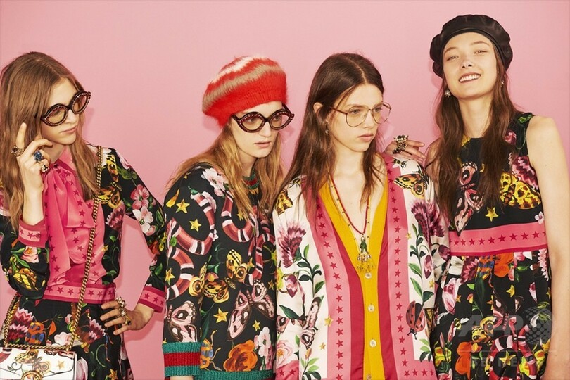 ウィメンズ ウェアおよびアクセサリーからなる同コレクションは、クリエイティブ・ディレクター、アレッサンドロ・ミケーレ(Alessandro Michele)による、ブランドアイコンの動植物を取り入れた新しいプリントが特徴だ。咲き乱れるカーネーションやローズに囲まれて顔を出すのは、カラフルなバタフライ、てんとう虫、小鳥、カブトムシ。中でもヨーロッパ貴族社会のシンボルとされるビー(ハチ)と英知・権威を象徴するスネークは、中心的な役割を果たしている。