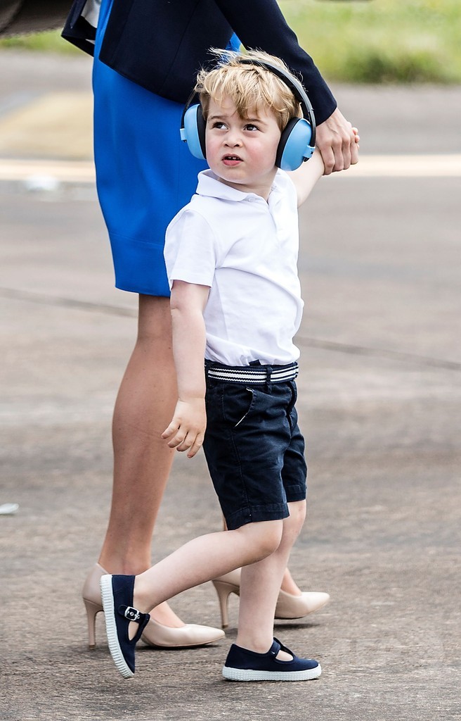 防音用の青いイヤーマフを装着したジョージ王子はウィリアム王子の手を借りながら、英空軍(RAF)のアクロバット飛行チーム「レッドアローズ(Red Arrows)」の航空機ホーク(Hawk)に乗り込んだ。