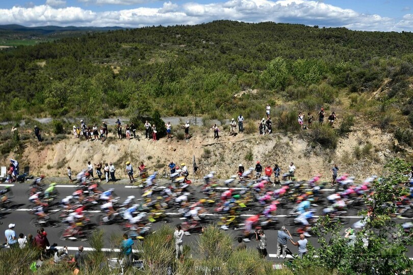 モンヴァントゥ(Mont Ventoux)の山頂がゴール地点となる第12ステージについて、大会主催者は、山頂に暴風が吹き荒れていることを理由に、コースを6キロメートル短縮することを決断。フルームのライバルたちにとっては、タイム差を縮める機会が少なくなってしまった。(c)AFP