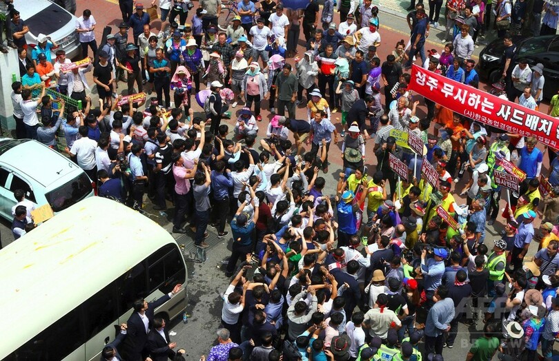 【7月15日 AFP】韓国で15日、米軍の迎撃システム配備が決まった南部・慶尚北(North Gyeongsang)道の星州(Seongju)を訪れた黄教安(ファン・ギョアン、Hwang Kyo-Ahn)首相に対し、怒った地元住民が生卵やペットボトルを投げつける騒動が起きた。