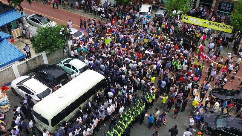 しかし、地元住民はTHAADが配備されれば、メロン栽培や住民の健康、環境に悪影響を与えるとして激怒。配備計画の撤回を求めて郡庁舎に集まった約3000人の住民に対し、黄首相は「事前に通知しなかったことを謝罪する」と述べた。(c)AFP/Hwang Sung-Hee