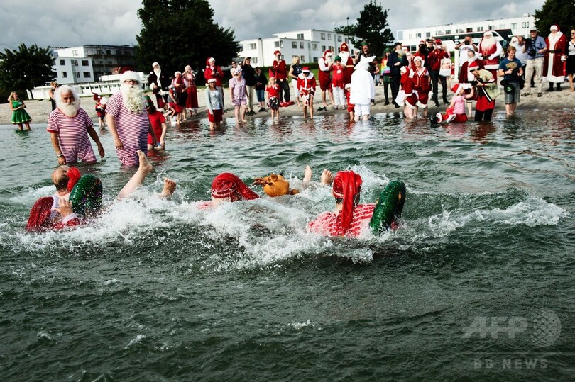 19日にはコペンハーゲンの北にあるベルビュー・ビーチ(Bellevue Beach)で、朝から水泳を楽しむサンタたちの姿も見られた。会議は20日まで開催される。(c)AFP