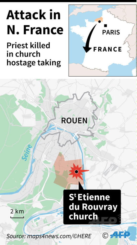 【7月26日 AFP】(更新、写真追加)フランス北部ルーアン(Rouen)近郊にある教会に26日、ナイフを持った2人組が押し入り、人質となった司祭1人が殺害された。また人質もう1人が重体だという。仏内務省は襲撃した2人を警察が殺害したと発表した。