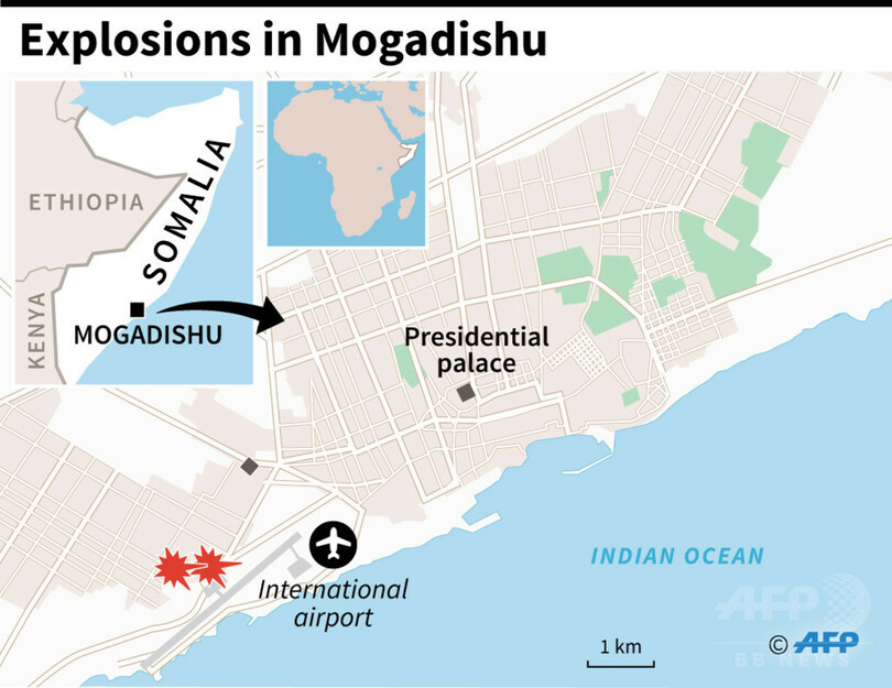 現場近くのモガディシオの空港は普段から厳重な警備が敷かれており、ソマリア中央政府を支援している「アフリカ連合ソマリア・ミッション(AMISOM)」が首都内に置く主要基地に隣接する。AMISOMはアルシャバーブとの戦闘でソマリア政府を支援するため2007年に派遣され、兵士ら2万2000人で構成されている。(c)AFP