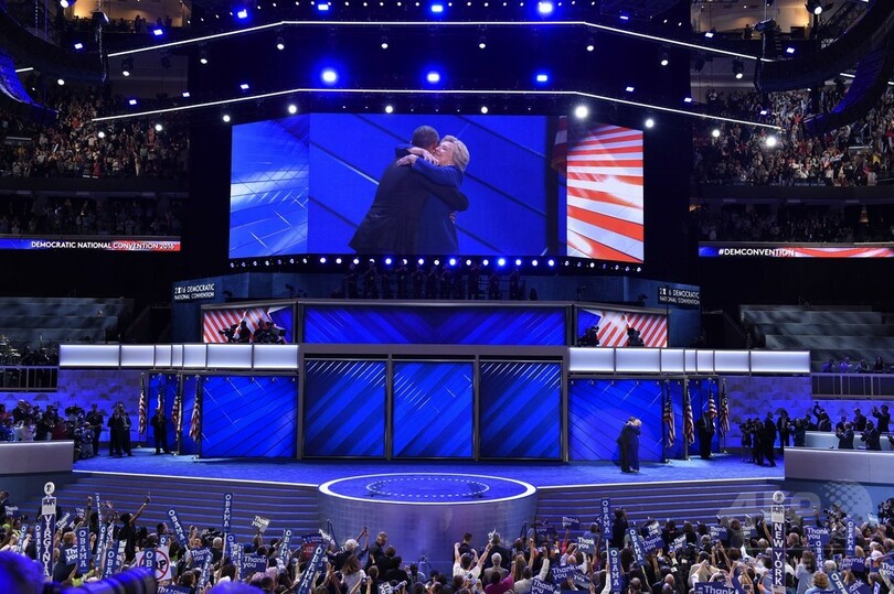 45分間に及んだオバマ大統領の力強い演説が終了すると、クリントン氏が壇上に登場。会場を埋め尽くした数千人の代議員や支援者から割れんばかりの歓声が湧き起こった。(c)AFP
