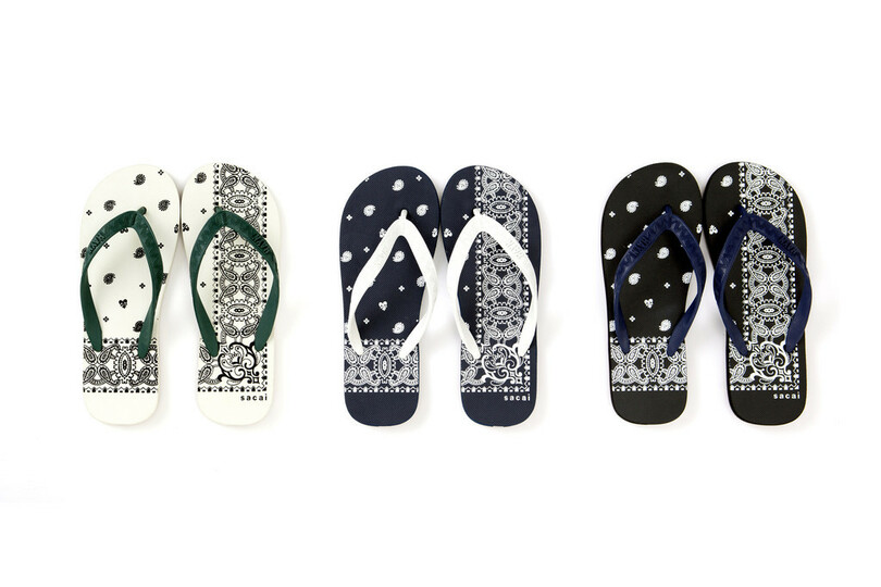 本コラボレーションでは、「サカイ」2016年初夏コレクションのアイコンであるバンダナ柄を左右で柄が続くようにデザインし、底面には反転した「サカイ」のロゴを型押しすることで、砂浜を歩いた時に足跡で「サカイ」のロゴが刻まれる、粋なディティールを施した。