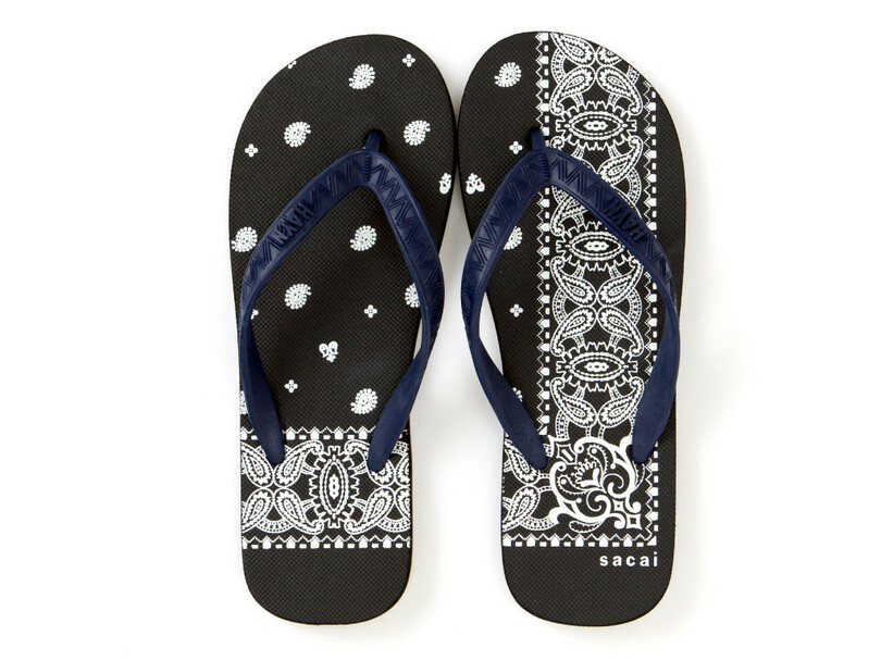 本コラボレーションでは、「サカイ」2016年初夏コレクションのアイコンであるバンダナ柄を左右で柄が続くようにデザインし、底面には反転した「サカイ」のロゴを型押しすることで、砂浜を歩いた時に足跡で「サカイ」のロゴが刻まれる、粋なディティールを施した。